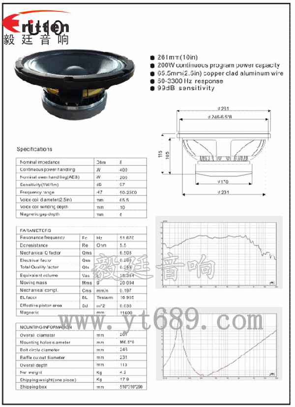 此款優異用于10寸品牌舞臺音箱喇叭,額定功率為200W,最大功率為400W,毅廷音響科技有限公司工程師研發出超重低音揚聲器,震撼強,發燒者的喜愛,值得信賴;