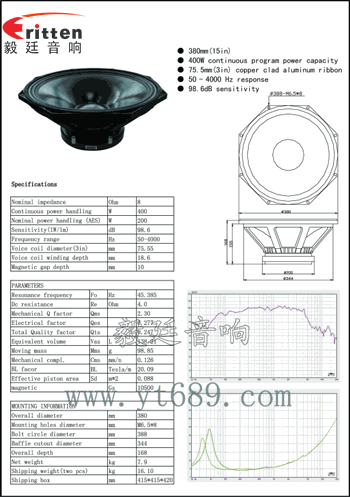 此款超大型超級重低音15寸舞臺音箱喇叭,額定功率達到200W,最大能承載400W,也可用于KTV音箱、演唱會音箱、廣場音箱上,聲音澎湃,打造出逼真的現(xiàn)場效果。